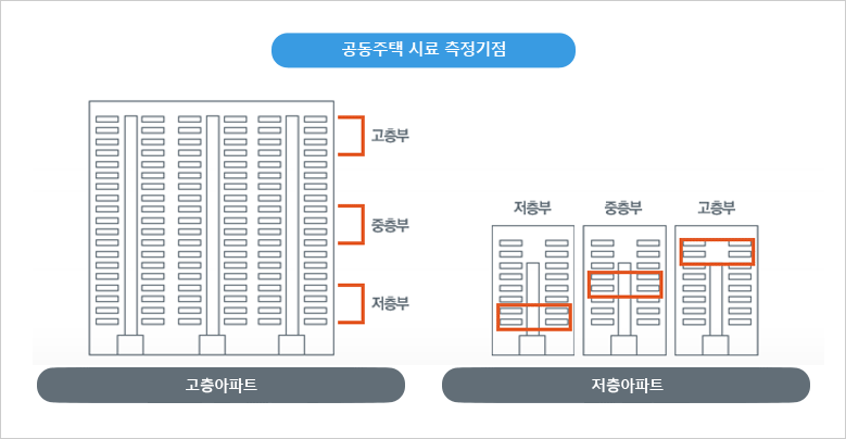 => 저층부 (3층 이내에서 선정), 중층부 (예 ; 15층 주동의 경우 7, 8, 9층 중에서 선정), 고층부 (최상부 3개층 이내에서 선정)의