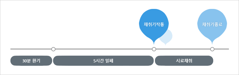 개구부 등은 모두 닫고 5시간 이상 밀폐상태를 유지한다. 이때 내장가구의 문은 열어둔다. 밀폐 후 정해진 유량으로 30분간 2회 시료