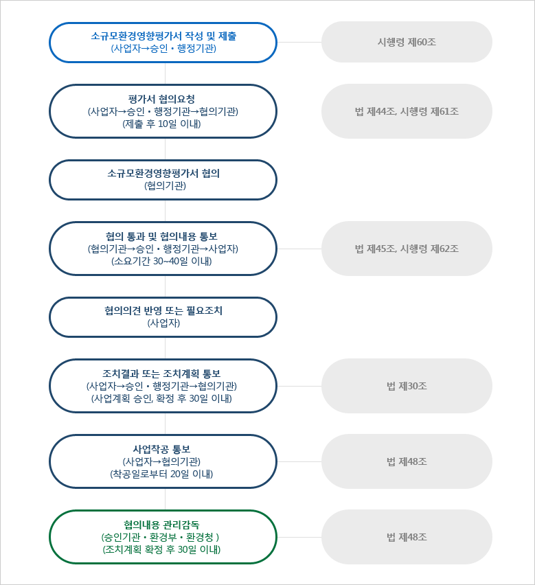 - 협의기관 : 환경부장관 또는 지방(유역)환경청장(검토기관 : 한국환경정책평가연구원)